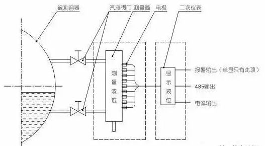 電接點(diǎn)水位計(jì)是根據(jù)汽和水的電導(dǎo)率不同測量水位的。高壓鍋爐的鍋水電導(dǎo)率一般要比飽和蒸汽的電導(dǎo)率大數(shù)萬到數(shù)十萬倍,電接點(diǎn)水位計(jì)是由水位測量容器、電極、電極芯、水位顯示燈以及電源組成。電極裝在水位容器上組成電極水位發(fā)送器。電極芯與水位測量容器外殼之間絕緣。由于水的電導(dǎo)率大,電阻較小,當(dāng)接點(diǎn)被水淹沒時(shí),電極芯與容器外殼之間短路,則對(duì)應(yīng)的水位顯示燈亮,反映出汽包內(nèi)的水位。而處于蒸汽中的電極由于蒸汽的電導(dǎo)率小,電阻大,所以電路不通,即水位顯示燈不亮。因此,可用亮的顯示燈多少來反映水位的高低。利用飽和蒸汽與飽和蒸汽凝結(jié)水的電導(dǎo)率的差異,將非電量的鍋爐水位變化轉(zhuǎn)換為電信號(hào),并由二次儀表遠(yuǎn)距離地顯示水位。電接點(diǎn)水位計(jì)基本上克服了汽包壓力變化的影響,可用于鍋爐啟停及變參數(shù)運(yùn)行中。電接點(diǎn)水位計(jì)離汽包很近,電極**二次儀表全部是電氣信號(hào)傳遞,所以這種儀表不僅遲延小而且誤差小,不需要進(jìn)行誤差計(jì)算與調(diào)整,使得儀表的檢修與校驗(yàn)大為簡化。在實(shí)際應(yīng)用中,電接點(diǎn)水位計(jì)水位的測量是斷續(xù)的,并且對(duì)與汽包連通的水位容器選擇必須適當(dāng),以減小測量誤差。