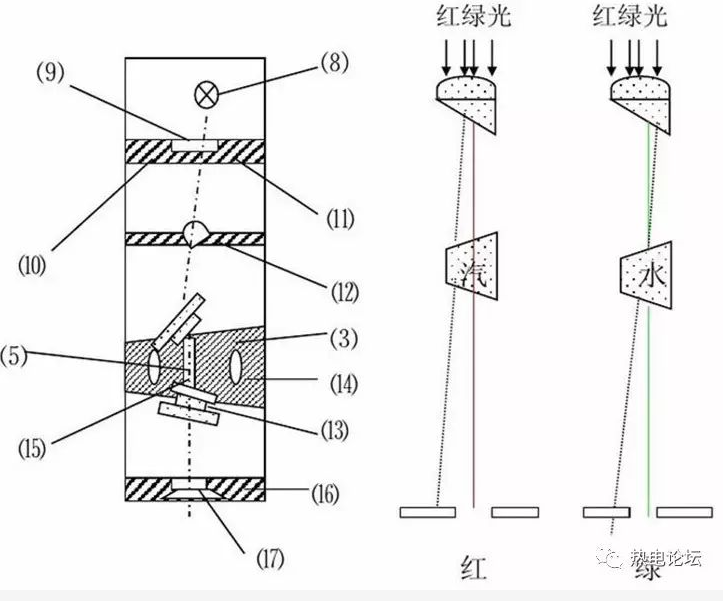 云母雙色水位計(jì)是采用連通器原理制成,利用光在不同介質(zhì)中呈現(xiàn)不同的折射率和反射特性,并借助于濾色片使液相呈綠色,氣相呈紅色來顯示汽包水位的。由燈泡發(fā)出的光,通過紅綠濾色片,再通過聚光境射向水位計(jì)本體,在水位計(jì)本體內(nèi),汽相部分紅光射向正前方,而綠光斜射到壁上被吸收;而在本體內(nèi)液相部分,由于水的折射使綠光射向正前方,而紅光斜射到壁上被吸收,因而在正前方觀測時(shí),可看到水位計(jì)顯示氣紅液綠,清晰透明。